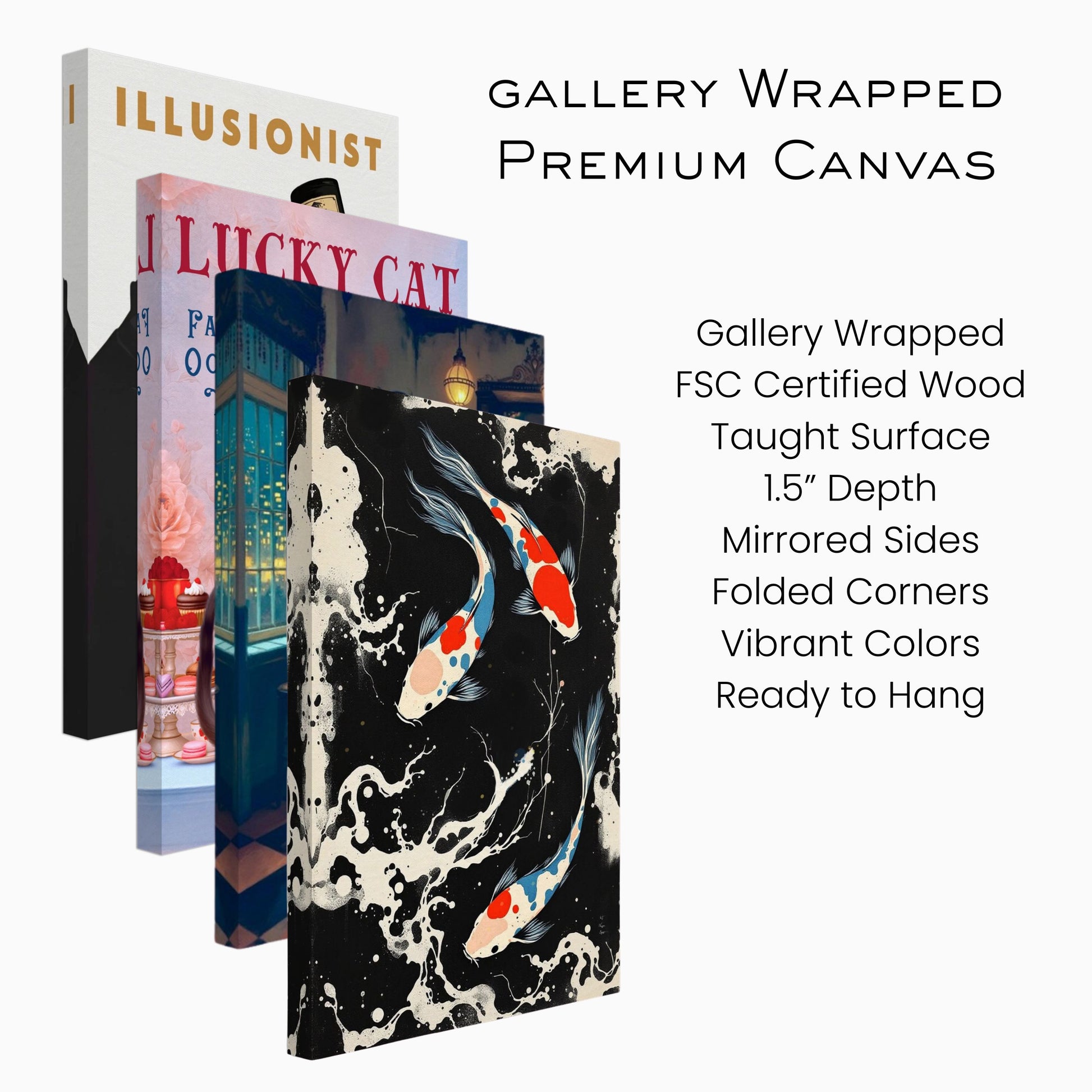 - Gallery Wrapped Canvas: Responsibly sourced FSC-certified wood stretcher bars, cotton-polyester blend (300-350gsm, 350-400 microns). Mirrored sides are 1.5 inches thick gallery wrapped. Arrives ready to hang!